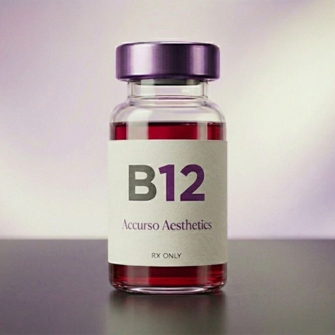 B12 injections deliver a concentrated dose of this essential vitamin, which may support energy production, cognitive function, and overall neurological health. This vital nutrient is often difficult to absorb through diet alone, particularly for those with digestive concerns or dietary restrictions that limit B12 intake. At Accurso Aesthetics, B12 therapy can help to combat fatigue, enhance mental clarity, and support your body's metabolic processes, whether you're addressing chronic tiredness, improving focus, or optimizing athletic performance. B12 injections offer a wellness solution for anyone seeking sustained energy and improved vitality.